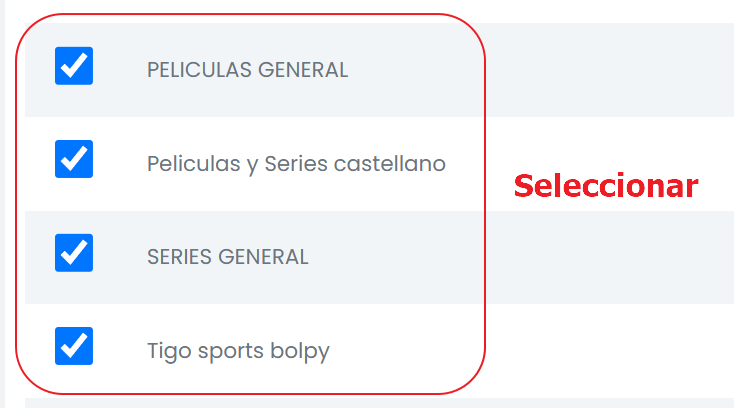 Se debe elegir solamente las carpetas Correspondientes a Películas, Series y también otra de Canales (Tigo Sports)